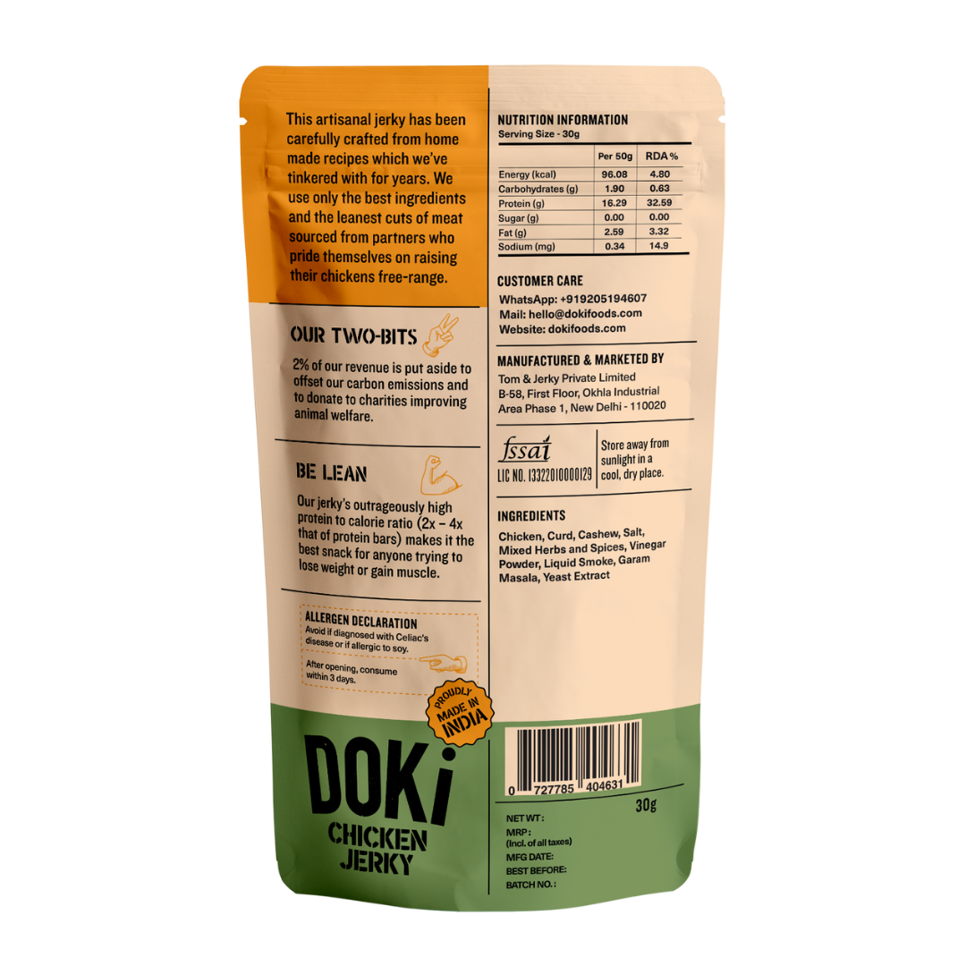 First, we take lean meat (that is meat with minimal fat) and cut it into thin pieces. Then, we marinade the meat for 24-48h in our secret sauces that correspond to the flavours you love (e.g. Teriyaki or Gochujang). After that we dry the meat to remove the water in it so that bacteria will be unable to grow and spoil it (this is how when grapes are made into raisins you can store them at room temperature for ages but normal grapes would go bad in a couple of days). We then pack it into nitrogen flushed bags (removing oxygen and moisture as a further step to ensure bacteria can't grow) and ship it to you.