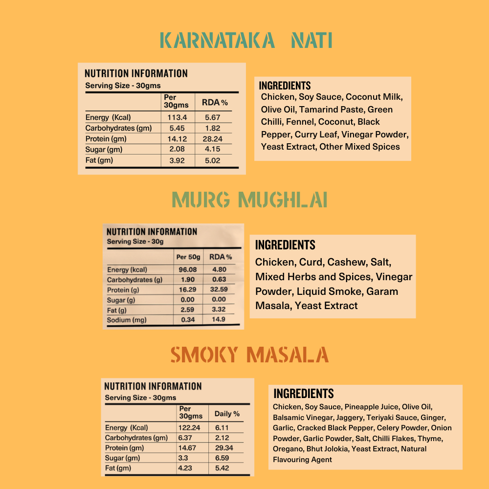 First, we take lean meat (that is meat with minimal fat) and cut it into thin pieces. Then, we marinade the meat for 24-48h in our secret sauces that correspond to the flavours you love (e.g. Teriyaki or Gochujang). After that we dry the meat to remove the water in it so that bacteria will be unable to grow and spoil it (this is how when grapes are made into raisins you can store them at room temperature for ages but normal grapes would go bad in a couple of days). We then pack it into nitrogen flushed bags (removing oxygen and moisture as a further step to ensure bacteria can't grow) and ship it to you.