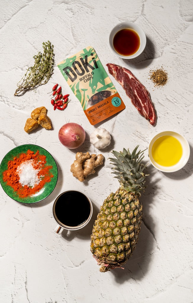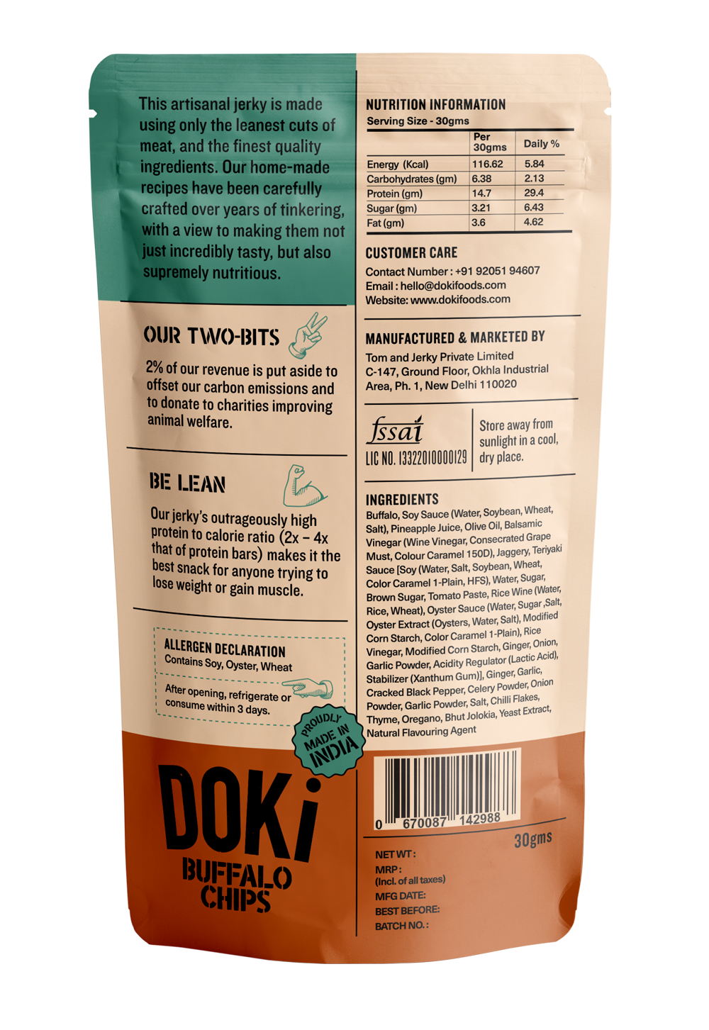 First, we take lean meat (that is meat with minimal fat) and cut it into thin pieces. Then, we marinade the meat for 24-48h in our secret sauces that correspond to the flavours you love (e.g. Teriyaki or Gochujang). After that we dry the meat to remove the water in it so that bacteria will be unable to grow and spoil it (this is how when grapes are made into raisins you can store them at room temperature for ages but normal grapes would go bad in a couple of days). We then pack it into nitrogen flushed bags (removing oxygen and moisture as a further step to ensure bacteria can't grow) and ship it to you.