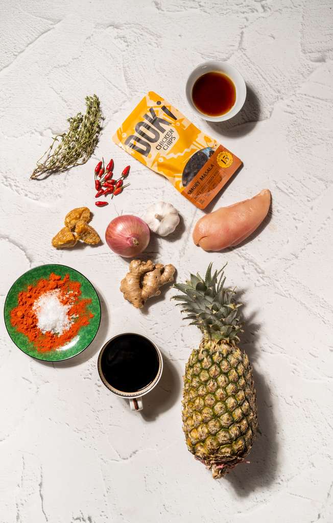 Chicken, Soy Sauce, Pineapple Juice, Olive Oil, Balsamic Vinegar, Jaggery, Teriyaki Sauce [Soy, Water, Sugar, Brown Sugar, Tomato Paste, Rice Wine, Oyster Sauce, Rice Vinegar, Modified Corn Starch, Ginger, Onion, Garlic Powder, Acidity Regulator (Lactic Acid), Stabilizer (Xanthum Gum)], Ginger, Garlic, Cracked Black Pepper, Celery Powder, Onion Powder, Garlic Powder, Salt, Chilli Flakes, Thyme, Oregano, Bhut Jolokia, Yeast Extract, Natural Flavouring Agent