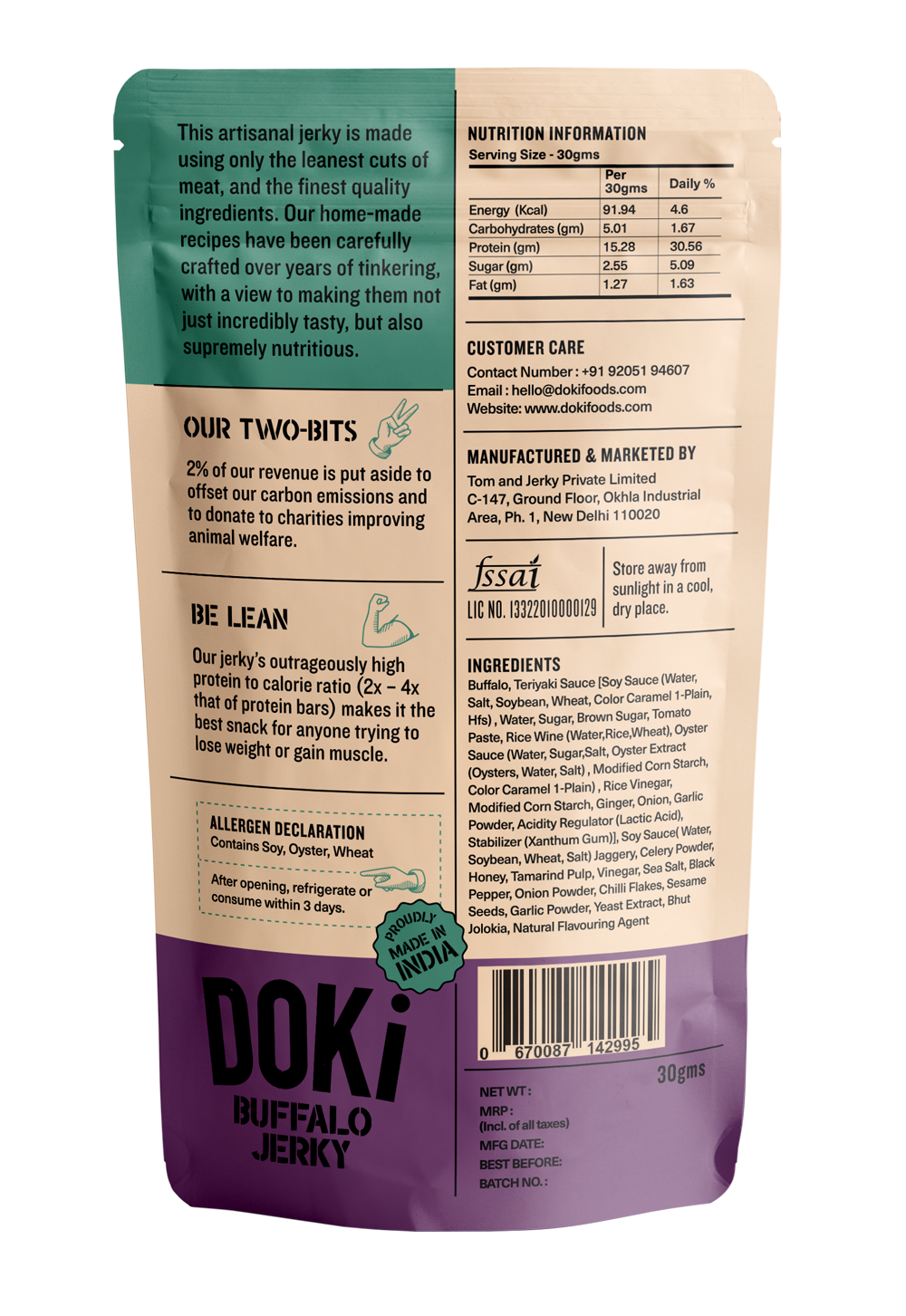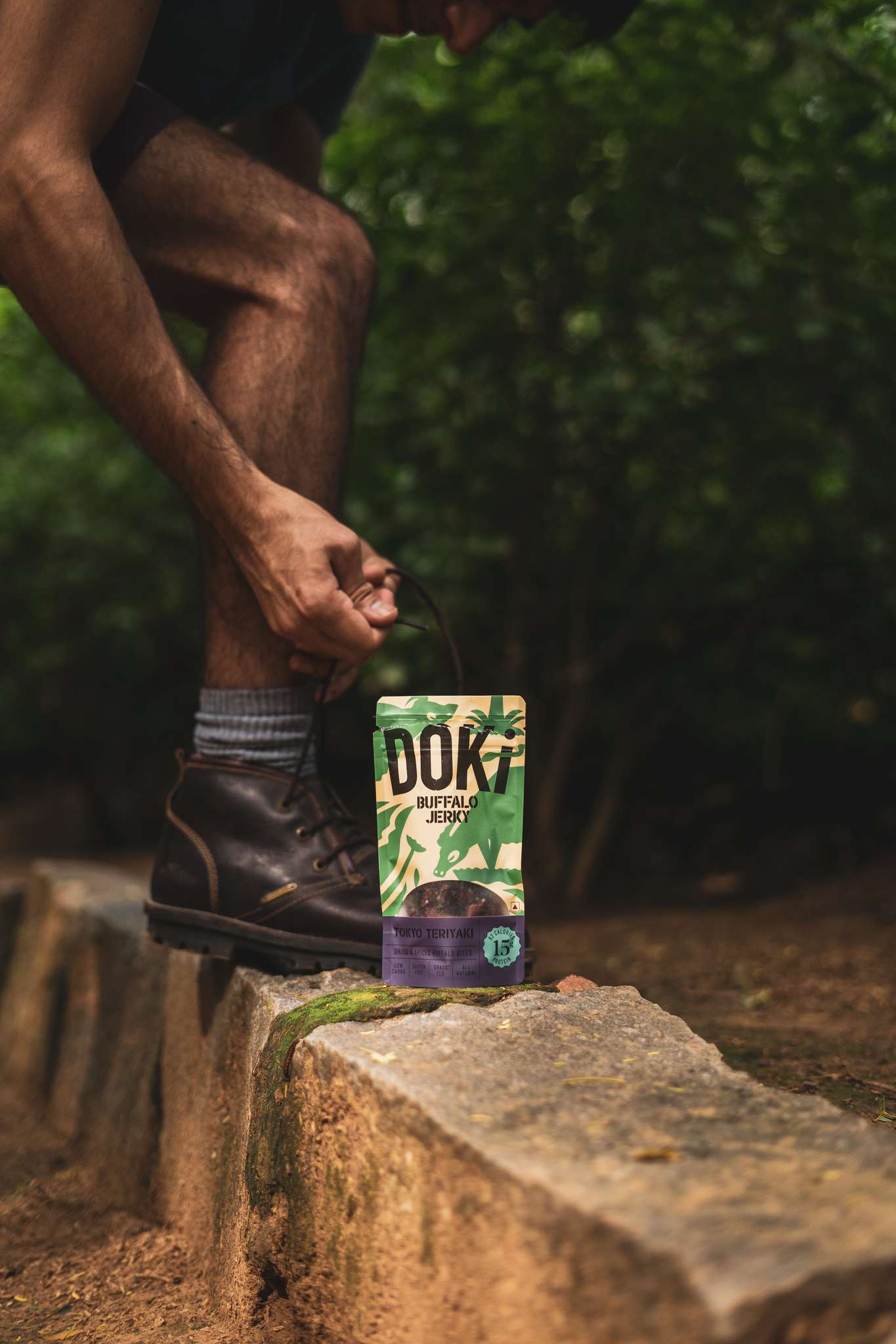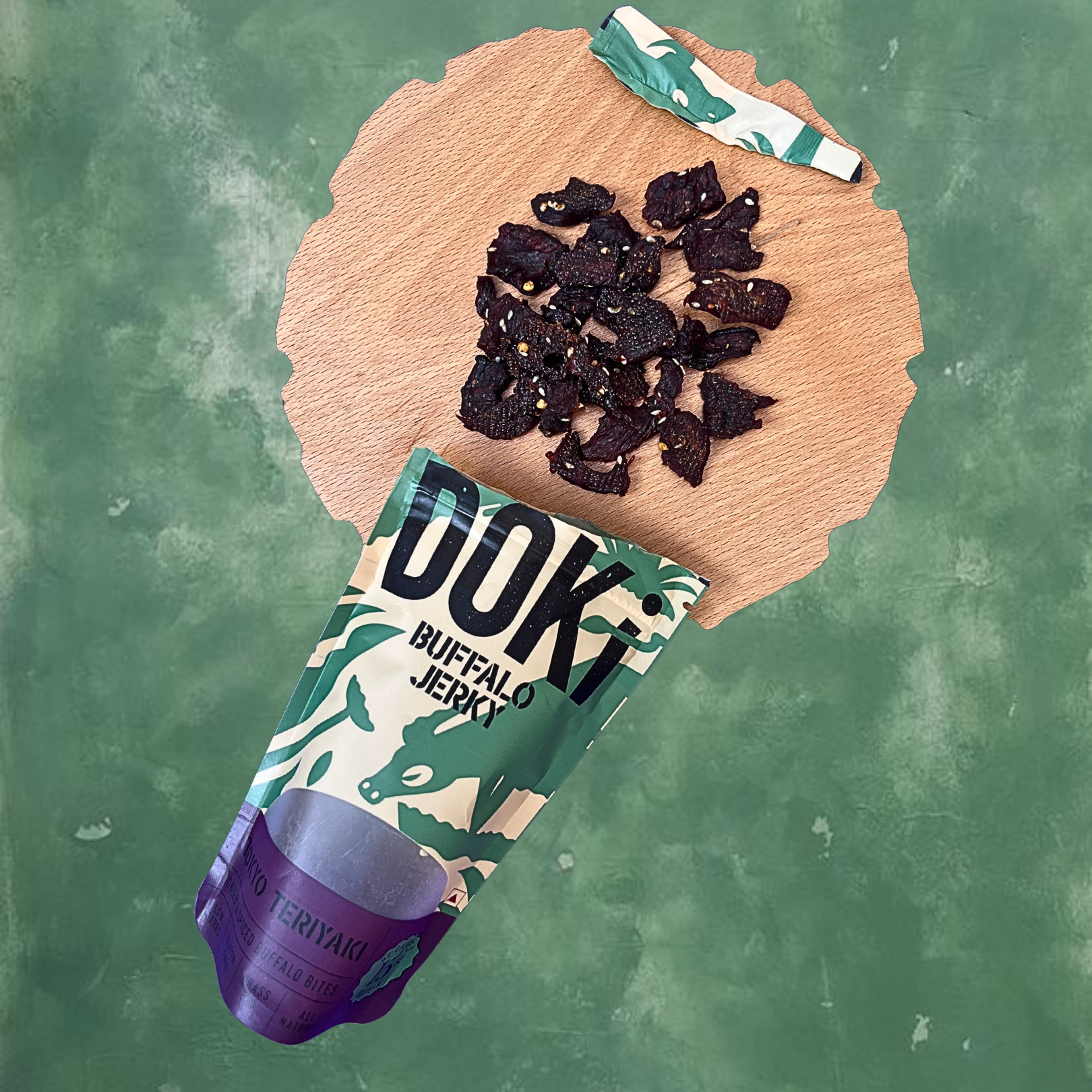 First, we take lean meat (that is meat with minimal fat) and cut it into thin pieces. Then, we marinade the meat for 24-48h in our secret sauces that correspond to the flavours you love (e.g. Teriyaki or Gochujang). After that we dry the meat to remove the water in it so that bacteria will be unable to grow and spoil it (this is how when grapes are made into raisins you can store them at room temperature for ages but normal grapes would go bad in a couple of days). We then pack it into nitrogen flushed bags (removing oxygen and moisture as a further step to ensure bacteria can't grow) and ship it to you.